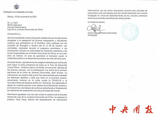 古巴驻华特命全权大使在信中对我校组织古巴驻华青年外交官与在华留学生于10月21日至26日参加“未来之桥”拉美青年领导人培训交流活动表示感谢。他表示,该项目中开展的活动使得古巴青年工作者和学生深刻了解到百年来中国共产党为保障社会民生、政治稳定和国家经济发展所做出的努力与斗争。