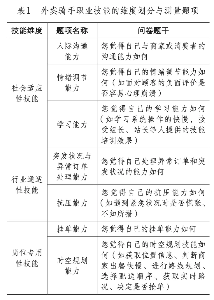 本研究设置了社会适应性技能、行业通适性技能与岗位专用性技能三个维度,由七个自评题项来测量。社会适应性技能侧重服务互动与自我调适,由人际沟通能力、学习能力、情绪调节能力三项来衡量;行业通适性技能强调对异常或突发情境的流程性应对与特殊处理,由突发状况与异常订单处理能力、抗压能力两项来衡量;岗位专用性技能强调配送任务组织与即时调度,由时空规划能力、挂单能力两项来衡量。各题项采用五点里克特量表计分,选项从“很差”(1分)到“非常好”(5分),得分越高表示自评技能水平越高。在技能类型划分方面,参照既有研究对外卖骑手职业技能的类型化框架[23][24],并结合平台配送劳动的工作过程特征,各维度定义及题项说明见表1。