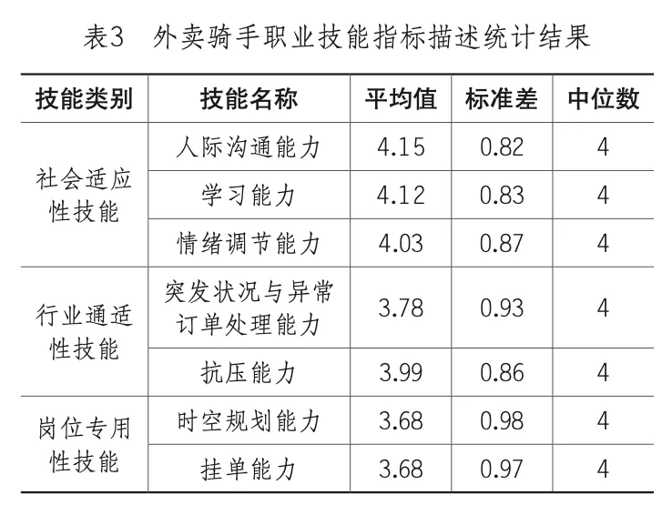 骑手职业技能题项的描述统计结果如表3所示。从平均得分来看,社会适应性技能题项整体得分较高,其中“人际沟通能力”与“学习能力”均在4.10分以上。行业通适性技能题项的平均得分略低,尤其是“突发状况与异常订单处理能力”。岗位专用性技能题项(时空规划能力、挂单能力)的平均得分相对更低,但总体仍处于较高水平。所有题项的中位数均为4,表明大多数骑手对自身技能的评价集中在“好”这一水平。从标准差来看,岗位专用性技能题项的得分变异性相对更大,提示不同骑手在任务组织与即时调度相关能力上存在更明显的个体间差异。