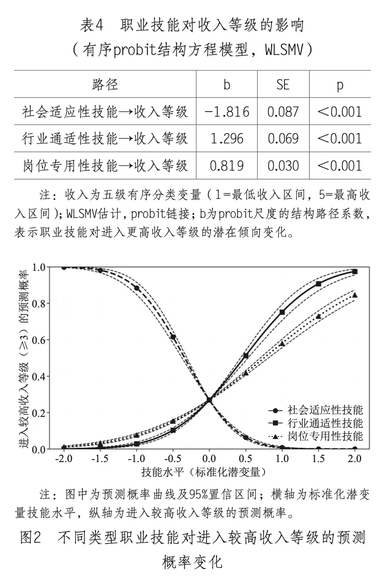 在主模型中,收入等级作为五档有序结果变量纳入结构方程框架进行估计,模型整体拟合良好(CFI=0.998,TLI=0.997,RMSEA=0.068,SRMR=0.027)。图1展示了不同类型职业技能对收入等级的结构路径关系,表4报告了相应的参数估计结果。在同时纳入社会适应性技能、行业通适性技能与岗位专用性技能的情况下,行业通适性技能对收入等级具有显著正向影响(b=1.296,p<0.001),岗位专用性技能同样呈显著正向影响(b=0.819,p<0.001)。然而,社会适应性技能显示出对收入等级的显著负向影响(b=-1.816,p<0.001)。