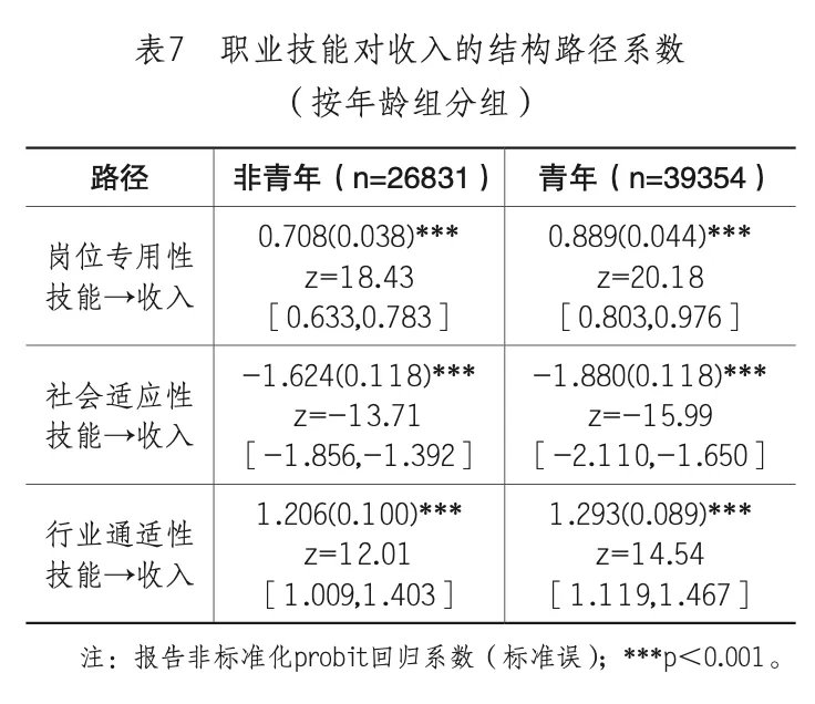 在性别差异分析的基础上,进一步将样本按年龄划分为青年(≤35周岁)与非青年(>35周岁)两组(青年n=39354;非青年n=26831)。研究采用多组结构方程模型(WLSMV估计)检验了职业技能与收入关系的年龄差异。施加载荷不变约束后模型拟合显著下降(Δχ2(4)=13.33,p=0.010),提示同一技能维度在青年与非青年群体中由各题项所反映的程度并不完全一致。因此,以下年龄组间结构路径比较主要用于描述性呈现与探索性分析,其解释聚焦于方向与相对强度,不作严格等值前提下的精确推断。在此基础上,对“三条技能→收入结构路径”的比较显示,三类技能对收入的影响方向在青年与非青年群体中保持一致,但回报强度存在一定差异(见表7)。其中,仅“岗位专用性技能→收入路径”存在显著年龄差异(Δχ2(1)=9.65,p=0.002),且该技能的收入回报在青年组中更强。社会适应性技能与行业通适性技能路径的跨组差异均不显著(p>0.05)。