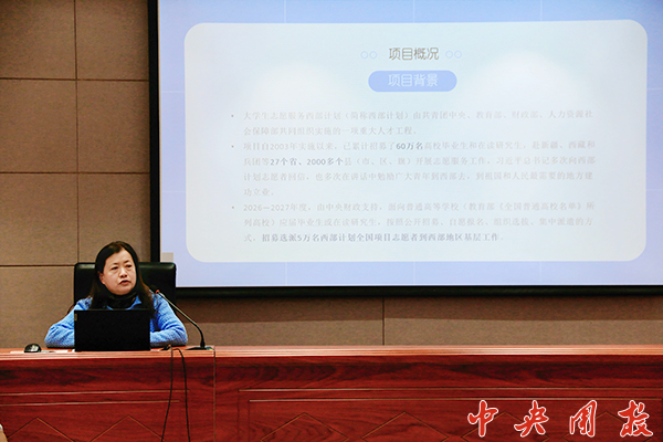 新闻中心讯(马婧鑫) 为进一步做好大学生志愿服务西部计划工作,4月10日,校团委举办北京市大学生志愿服务西部计划宣讲会。