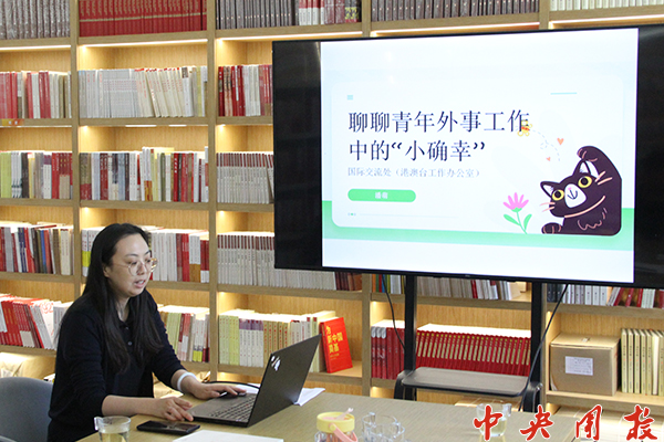 新闻中心讯 5月17日,首期青年骨干培养计划“青年说”主题沙龙活动在万年青书园举办。青年骨干培养计划成员、国际交流处(港澳台工作办公室)教师潘萌以“聊聊青年外事工作中的‘小确幸’”为主题作分享。