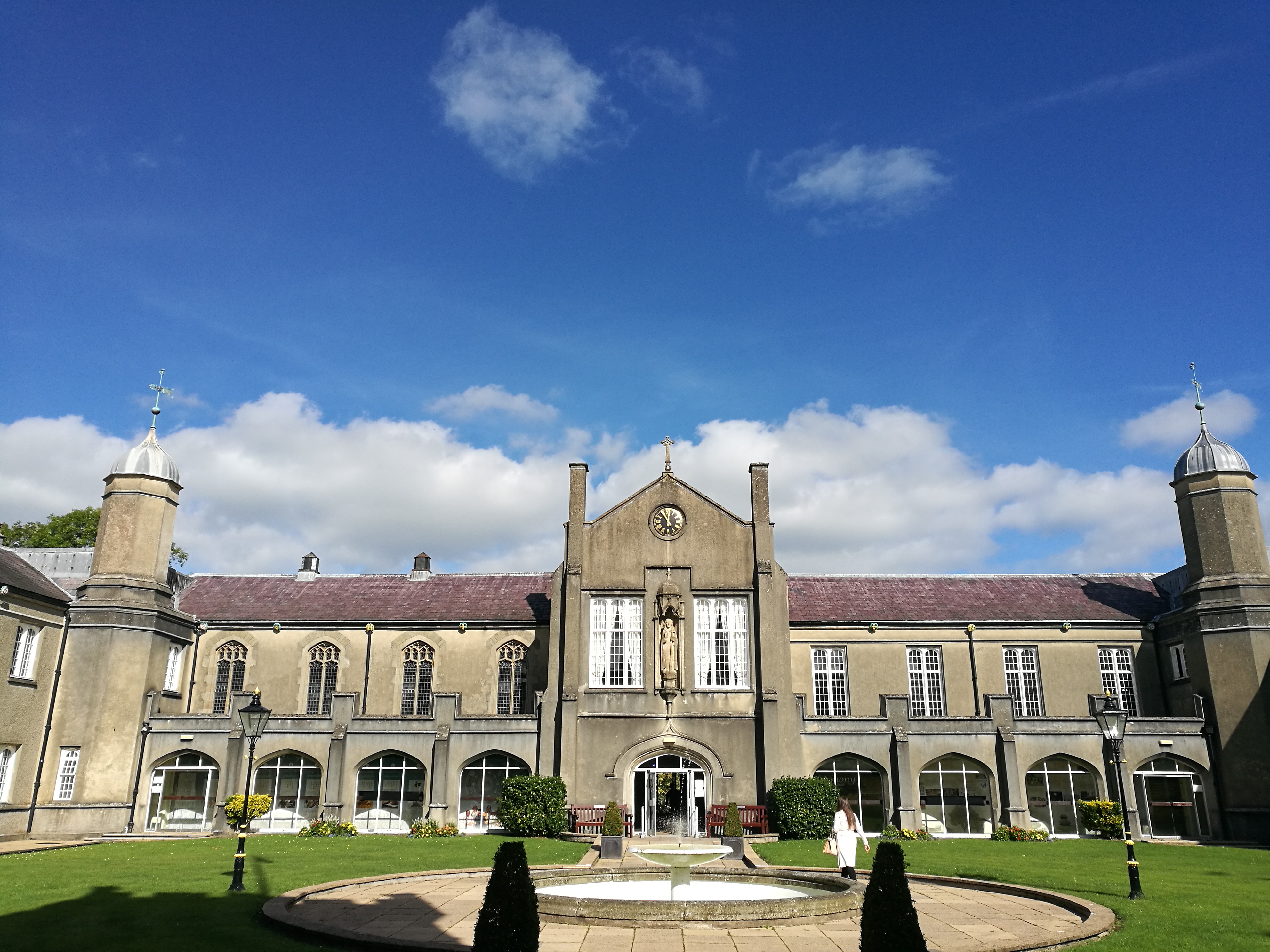 我们所在的兰彼得校区是威尔士大学的分校区之一,兰彼得镇很小,居民不过几千人,非常宁静。走在校园里常常可以看见羊群在山上悠闲地吃草,就是记忆里无数欧洲电影中的景象。小镇里生活、购物都很方便。小镇里的街道、广场总是整洁干净,走在街上的人们也常向你点点头,投来一个微笑。